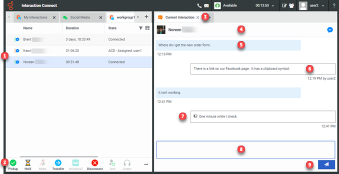To pick up, place on hold, transfer, record, or disconnect a Facebook interaction, use the Queue Control toolbar buttons. The Pickup button also appears in the Current Interaction view for alerting and held interactions.